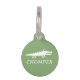Dieses Tier-ID-Tag zeigt eine weiße Alligator-Illustration auf einem angenehmen Weissgrün-Hintergrund, wobei ein bestimmter Bereich für den Namen des Tieres in einem stilvollen Schriftart angezeigt wird, der die Ästhetik des Tags insgesamt verbessert. Die Kombination der Alligatorgrafik mit der weichen grünen Farbe macht es zu einem reizvollen Accessoire für ein Tier, das sowohl Charme als auch Personalisierung bietet und gleichzeitig die Identifizierung des Haustieres gewährleistet.