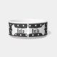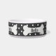 Weißer Hundeknochen mit Hundename auf weißen Polka-Punkten und schwarzem gestepptem Hintergrund. Name ist bearbeitbar.