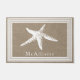 Erhalten Sie einen rustikalen Bauernhausstrandblick mit dieser Fußmatte. Es ist eleganter weißer Starfish, den Silhouette heraus auf einem Imitatleinwand-Hintergrunddruck mit Ihrem personalisierten Familienmonogrammnamen im Weiß steht. Der Rand hat weiße Linien Rahmenentwurf.