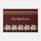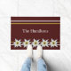 Inspirierte europäische Türmatte in dunkelrot mit einer Grafik von Edelweiss-Blume und gelb-weiß gestreiften Akzenten. Personalisieren Sie den weißen, benutzerdefinierten Text nach Ihren Bedürfnissen.