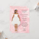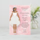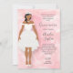 Rosa Aquarelluntergrund Quinceañera Geburtstagsfeier Einladungen mit einem hübschen Mädchen mit schwarzem Haar und dunkler Haut mit einem modernen Hi-Low-Hem-Gewand mit einem schwachen silberfarbenen Muster über dem Rock, einem Taillenbogen, Schultergurten, Perlenhalskette, weißes Tiara und weiße Schuhe. Perfekt für jeden 15. Geburtstag einer Prinzessin. Andere Haarfarben in unserem Geschäft verfügbar.