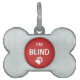 Einfache rot-weiße Markierung für blinde Haustiere. "Ich bin blind" in der Mitte und eine kleine, weiße Pfote druckende Silhouette unten.