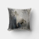 Weißes Pferd auf rustikaler Holzstruktur im schneebedeckten Winterwald.