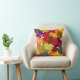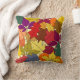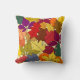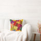 Dieses Kissen hat ein Design eines Haufen von Blätter in grün, gelb, orange, blau, braun und rot auf einem hellgelben Feld.