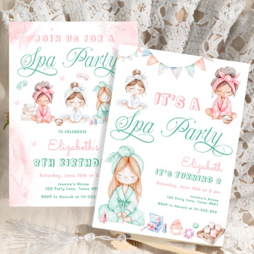 Der Wellness-Center Party Kindergeburtstag Invitation design ist eine wunderschön gestaltete Einladung, die Sets für eine entspannende und glamouröse Feier. Die Pastellfarben Rosa, Lavendel, Pfefferminzgrün und Weich-Blau verleihen dem Raum eine ruhige und einladende Atmosphäre. Das Design ist im Aquarellstil gehalten und verleiht ihm ein Licht, Träume und künstlerisches Ambiente. Die Einladung enthält bezaubernde Illustrationen über das Wesentliche des Wellness-Centers - flauschige Handtücher, Gurkenscheiben für Augenmasken, Lotion-Flaschen, Nagellack und flauschige Schminkbürste. Ein Wellness-Center oder Hausschuhe in passenden Pastelltönen symbolisieren das Verwöhnerlebnis, das jeder Gast erwartet. Alles in allem ist dieses Wellness-Center Party Girl Birthday Invitation eine perfekte Mischung aus Eleganz, Spaß und Entspannung und verspricht ein angenehmes Erlebnis, bei dem es um Verwöhnen und Feiern in einer beruhigenden, stilvollen Atmosphäre geht. Matching-Elemente verfügbar.