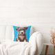 Welpe mit blauen Augen sitzend und unschuldig auss Kissen