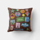 Der Entwurf umfaßt Länder und Bestimmungsorte von sechs Kontinenten, sowie eine eingebildete Fluglinie, Ozeandampfer, Hotel, Gasthaus, Countryklub, lächelndes Gesicht - und sogar erinnern ein Aufkleber Sie, Ihre Zähne zu putzen. Dieses wunderliche doppelseitige Kissen ist für Reisende und Abenteurer perfekt.