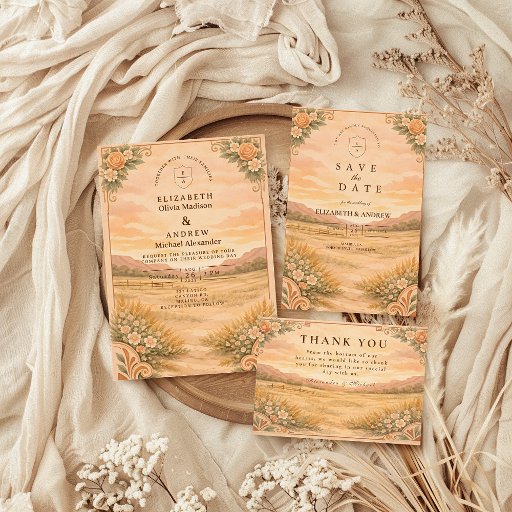 A rustic western wedding design inspired by desert landscapes, warm earth tones, and vintage botanical details. Featuring a sun-washed desert scene, wooden fencing accents, and soft florals, this invitation is perfect for ranch weddings, western celebrations, or couples planning a desert-inspired ceremony. Elegant, timeless, and fully customizable for your special day.