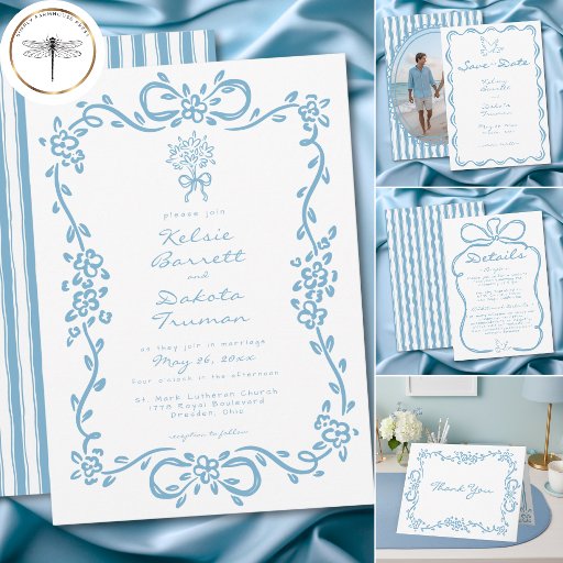 Celebrate your love with this whimsical blue handrawn and hand written wedding invitation design. Featuring a delicate floral border and charming hand-drawn bow details, it is perfect for a romantic garden ceremony. This elegant, coquette-inspired aesthetic offers a timeless look for your unique celebration. Created by Simply Farmhouse Press.