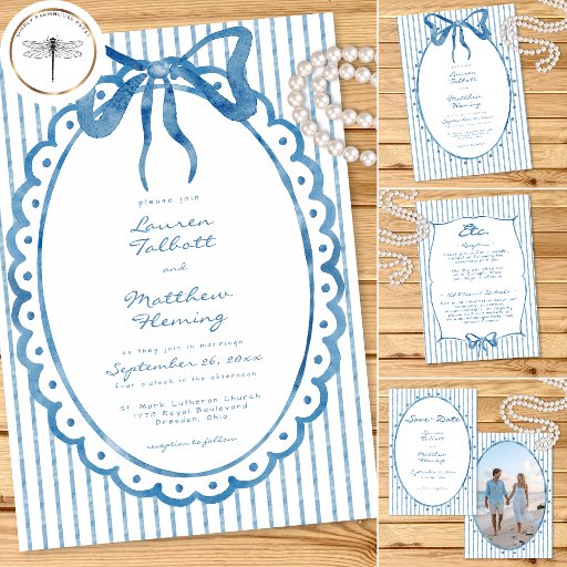 This whimsical invitation features a soft blue watercolor bow and a playful scalloped oval frame against a classic blue and white striped background. Perfect for a wedding with a preppy or coastal aesthetic, this charming design provides a sweet, hand-painted look for your special celebration. Created by Simply Farmhouse Press.