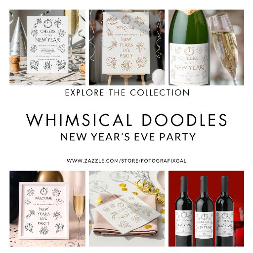 happy new yearnew years eve partywhimsical doodle drawingsgenerativecontentnye party decorblack and whitemidnight clock iconfireworks and bubbly2026 new yearnye icons