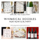 Whimsical Doodles Black Text Happy New Year 2026. Playful doodle illustrations. Easily personalise words as required. Black and white.