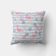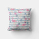 Kissen mit einem Muster mit einer lustigen sommerlichen Atmosphäre. Rosa Flamingos und Ananas Set auf einem hellblau gestreiften Muster mit Blätter und Herzen herum.