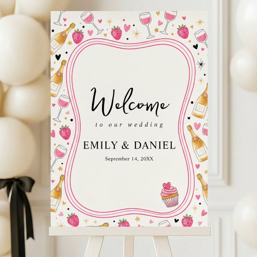 This whimsical wedding invitation design features soft pink tones with charming hand-drawn strawberries, champagne bottles, wine glasses, hearts, and a cupcake accent. The playful illustrated border frames elegant typography, blending romance with a fun, celebratory vibe. Perfect for couples seeking a sweet, modern wedding aesthetic with a lighthearted touch inspired by love, wine, and joyful moments.