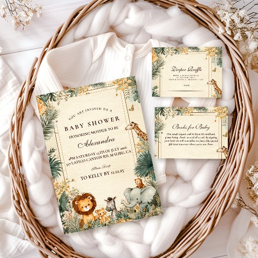 Bring a touch of adventure to your celebration with this whimsical safari theme, featuring hand-painted baby animals nestled among soft jungle foliage. The warm neutral palette, delicate greenery, and gentle watercolor textures create an inviting, storybook atmosphere perfect for an elegant baby shower. Personalized details are framed by a charming lion, elephant, giraffe, and zebra, making it a delightful keepsake for the mom-to-be. A beautiful blend of modern boho and woodland safari style, ideal for any gender-neutral celebration.