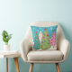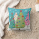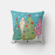 Weiße Weihnachtsbäume Kissen, künstlerische handgezeichnete Weihnachtsbäume und Schneeszene. Die Vorderseite des Kissens ist 4 Kalkbäume in aquamarinen, grünen, rosa und cremefarbenen, auf schneebedeckten Bergen stehend. Die Kissenrückseite ist ein einsamer, grüner Baum mit koordinierenden Farben. Die Vorderseite des Kissenrückens ist digital signiert von Künstler: g.gabel. *Alle Grafiken von Gail Gabel, Künstler.