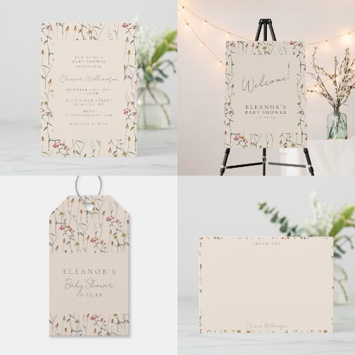 This baby shower thank you card features a delicate wildflower pattern in soft pink, green, and gold on a cream background. The botanical design creates an elegant yet gentle aesthetic for expressing gratitude after your celebration. Perfect for expecting moms who want their thank yous to feel thoughtful and pretty. The floral border frames your personalized name beautifully.