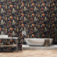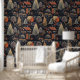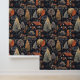 Whimsikal gemütliche dunkle Herbst Fall Wald Wälder botanischen Muster. Elegantes, Vintages Design in der Natur inspiriert. Wandtapeten mit abnehmbarer Schale und Knüppel sind ideal für Wohnungen, Mieten und kurze Termingeschäfte. Wallpaper Peel and stick lasse Ihnen, Ihre kleine Wohngestaltung zu erweitern und Ihre Miete mit Ihrer einzigartigen Design-Ästhetik zu personalisieren. Keine langweiligen weißen Kisten mehr! Das Design ist in warmen Orange- und Grüntönen auf dunklem Hintergrund gehalten. Das Design-Motiv umfasst Hütten, Bäume, Blätter, blumengeschmückte botanische und waldreiche Tiere wie Bären.