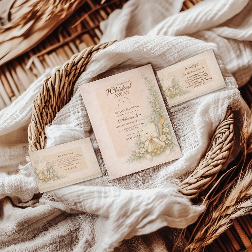A soft, romantic design inspired by vintage baking details, featuring wooden spoons, a whisk, delicate florals, and warm neutral tones. The gentle watercolor style and airy layout create a cozy, elegant atmosphere—perfect for a relaxed, intimate gathering celebrating the bride-to-be. Ideal for hosts who love timeless charm with a subtle culinary twist.