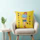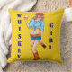 Kopfkissen mit einem Pop-Art-Button zur Illustration eines Rodeo-Mädchen in Cowboy-Hut und Glas Whiskey in der Hand vor einem gelben Hintergrund mit weißen Punkten.