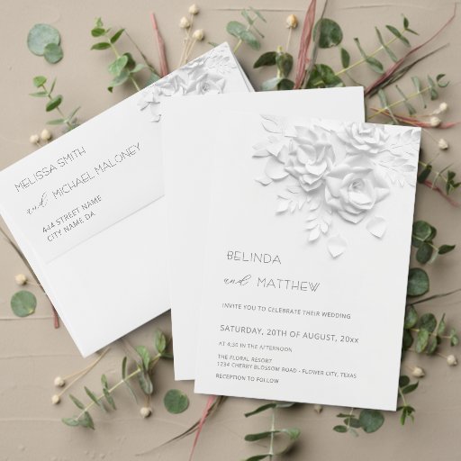 This elegant simple quiet luxury wedding invitation features contemporary white 3 dimensional roses.