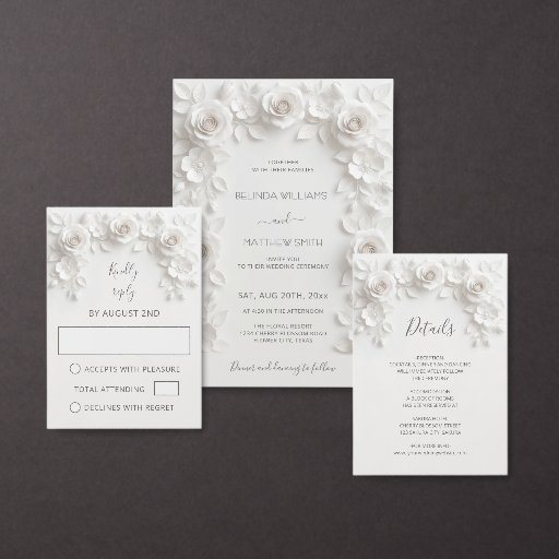 White faux paper cut roses 3D flowers wedding response card. Matching invitation available.