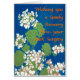 Eine hübsche, blumengeschmückte "Get Well"-Grußkarte für jemanden mit Back Operation, mit weißen Geranien auf blauem Hintergrund, von einem Screenprint von Judy Adamson. Sie können Ihre eigene Insider-Nachricht hinzufügen.