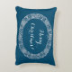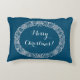 Ein schick Weihnachtskissen oder Kissen, um sich mit einem Weihnachtskranz von Heiligen, Efeu, Poinsettias, Tannenkegel und Zwiebeln von Tannenbaum. Dieser handgezeichnet Weihnachtskranz ist in Weiß auf einem blauen Hintergrund, den Sie ändern können, wenn Sie wollen, mit "Frohe Weihnachten" auch in Weiß, die Sie auch ändern können.