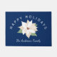 Diese Weihnachtsmatte zeigt eine handgezeichnete weiße Poinsettia auf dunkelblauem Hintergrund. Kurzer Text, oben steht: Happy Holidays. Benutzerdefinierter Text am unteren Rand erlaubt es Ihnen, Ihren Namen hinzuzufügen.