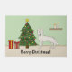 Desteis originelle Cartoon-Illustration eines niedlichen Weißschweizer Hirten / Weißfarben Deutscher Schäferhund. Der Hund wird von einem festlichen Weihnachtsbaum stehend, der mit roten und gelben Ornamenten verziert ist, einer Perlgarage und einem gelben Stern, der auf dem Baumgipfel steht. Es gibt auch zwei Geschenke vom Baum umwickelt und hinter dem Hund gibt es ein braunes Regal mit zwei Kerzen. Der Boden ist beige, die Hintergrundfarbe hellgrün. Es gibt auch einen personalisierbaren Textbereich, der jetzt lautet: "Frohe Weihnachten!".