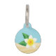 Desteis Illustration einer weißen frangipani plumeria Blume mit grünen Blätter. Die Hintergrundfarbe ist blau mit Sandtextur unten. Auf der Rückseite befinden sich personalisierbare Textbereiche für den Namen des Tieres und für eine Telefonnummer.