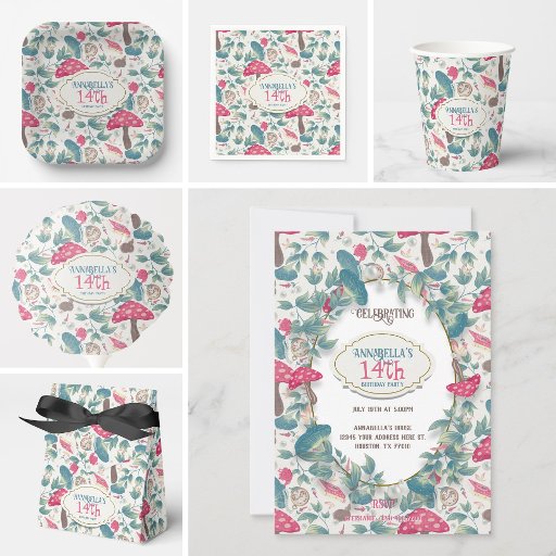 A whimsical design with florals, cute bunnies, mushrooms, and plenty of greenery.