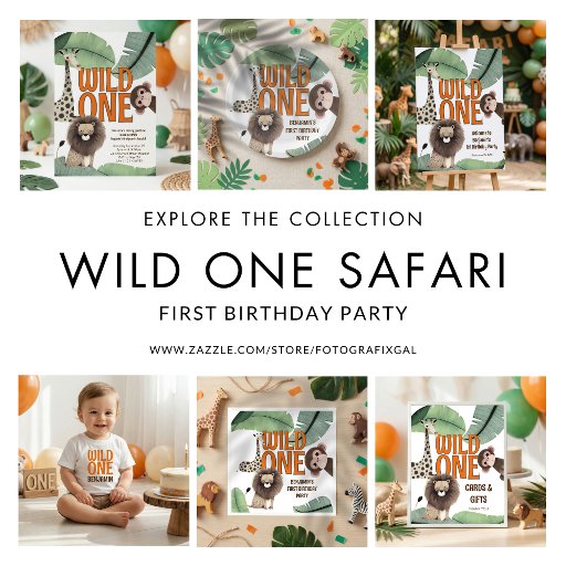 Wild One Cute Safari Animals 1st Birthday Party. Available digitally and printed. Sweet safari animals and forest greenery for your little one's first birthday celebration! Easily personalise text to your own details.