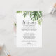 Diese wildromantische Begrüßungstour mit Begrüßungsschreiben und Kartenkarten sind perfekt für eine Begrüßungstasche mit Hochzeit in Urlaubsort. Das Design besticht durch eine exotische Auswahl an grünen Bananenpalmen, Farnen, Blattwerk, botanischen Pflanze und Grünpflanzen, die für einen tropischen Sommer sorgen. Auf der Vorderseite der Karte finden Sie einen Begrüßungsbrief und eine Reiseroute. Geben Sie eine Karte Ihres Resorts mit den wichtigsten Orten auf der Rückseite der Karte an.