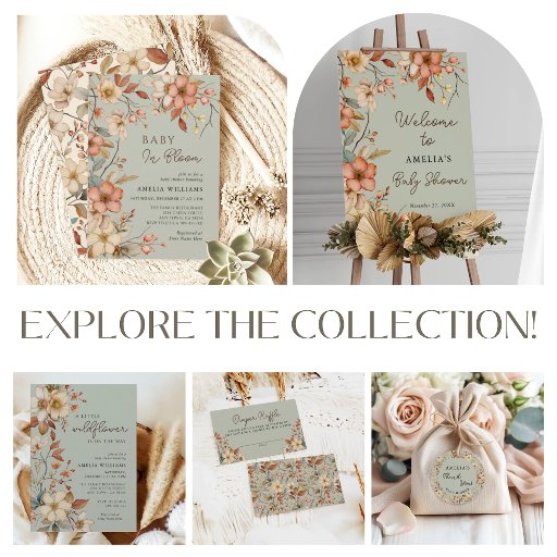 Die Boho Fall Wildblumen präsentieren die Green Baby Shower Collection, eine reizvolle Mischung aus Wärme und Laune. Dieses charmante Design besticht durch sanfte Wildblumen, die in einem gemütlichen Bogen aus Terrakotta und Salbei-Grün gerahmt sind. Das Ambiente ist perfekt, um die Ankunft eines kleinen Neuen zu feiern. Herzlich willkommen in einer herzlichen böhmischen Feier, die die Freude und Vorfreude an diesem besonderen Tag mit einer einladenden Touch des Flairs im Herbst erweckt.