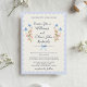 Floral Wedding invitations with beautiful romantic delicate watercolor wildflowers in blue and pink, with soft blue ribbon on a vintage cream scalloped background. Easy to personalize names, and wedding invitation wordings in a lovely script fonts. Pretty country wedding style. Back of wedding invitation is a pastel pink.
