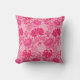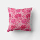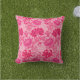 Kissen im Freien in einem Vintagen William Morris, Jugendstil, floraler Ausdruck stylisierter Chrysanthemen, digital verstärkt und farbig, in den Tönen tieffuchsienrosa, Azaleenrosa und Bordeaux, auf einem hellrosa Hintergrund