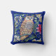 Throwkissen in einer Kunst Nouveau, Tapisseriemuster Williams Morris, eine tan und beige Eule gegen Fantasie-Blumen und -Blätter, mit einem tiefen Kobaltblauhintergrund und -grenze kennzeichnend