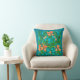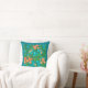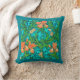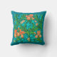 Pillow in einem William Morris, Kunst Nouveau, der Textildruck von Iris und von Blätter, digital erhöht und, in der Orange, im Limonen Grün und im weichen Aqua, auf einem tiefen Türkishintergrund gefärbt