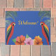 Begrüßungsmatte mit zwei farbenfrohen Papageien, Hibiskus-Blume und Palmen-Blätter für Ihre Ti-Bar, Luau oder tropisches Ambiente! Fügen Sie einen Namen oder einen anderen Text unter dem "Willkommenstext" hinzu, wenn Sie möchten.