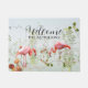 Willkommen Moderne tropische Flamingo Familie Name Türmats verfügt über rosa Flamingos Akzente mit tropischer Vegetation mit dem Drehbuch "Willkommen" und Ihrem personalisierten Namen. Personalisiert mit Ihrem Familiennamen an der Basis. Entworfen von © Evco Studio www.zazzle.com/store/evcostudio