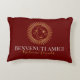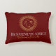 Stilvolles Kissen mit rotem Hintergrund, Goldmond und sonnengraphischen und hellgrauen und goldenen Schriftart, um Freunde und Gäste auf Englisch und Italienisch willkommen zu heißen.