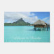 Das Hotel befindet sich in einem Foto einer Paradieslandschaft mit einem luxuriösen Flitterwochenresort in der blauen Lagune von Bora Bora mit Blick auf die tropische Insel in Französisch-Polynesien und dem Text "Willkommen im Paradies".