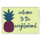 Willkommen neue Nachbarn oder potenzielle Kunden in der Nachbarschaft mit dieser lustigen Grußkarte. Es zeigt eine Abbildung einer Ananas - ein Symbol für Begrüßung und dunkelblau-grüner Text gegen einen blassgelben. Es hat eine lustige Sommer-und tropische Atmosphäre. Das Innere dieser Grußkarte ist für Sie bereit, mit Ihrer eigenen Nachricht zu personalisieren.