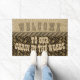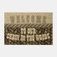 Schöne zeitgenössische Imitate Burlap, Weidengewebe Textur Muster und Seil. Mit "Willkommen in unserer Hütte im Wald" Zitat Design. Dekoratives, niedliches und modernes Wohngestaltung-Produkt für die Dekoration des Eingangs Ihrer Zuhause, Veranda Ihres Strandhauses, Hütte, Blockhütte, See- oder Flussurlaub Zuhause.
