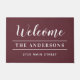 Elegante und zeitlose benutzerdefinierte Türmatte bietet "Welcome" in der Kalligraphie-Skripterstellung mit dem Nachnamen Ihrer Familie und Ihrer Zuhause-Adresse personalisiert in Weiß mit schlichten Stripakzenten. Beachten Sie, dass die dunklen Merlot-/Weinrot-Hintergrundfarben und die weißen Textfarben so angepasst werden können, dass sie mit der Veranda oder der Eingangsdekoration abgestimmt werden.