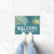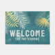 Das Welcome Tropical Golden Palm Family Name Doormats Door Mats besticht durch ein modernes tropisches Palmenblattmuster in einem goldenen und aquamarinen Design mit dem Text "Welcome" und Ihrem personalisierten Familiennamen am Fuß. Entworfen von © Evco Studio www.zazzle.com/store/evcostudio