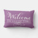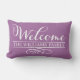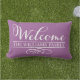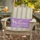 Das stilvolle Outdoor-Kissendesign "Welcome" in modernem, weißem Drehbuch mit eigenem Familiennamen und dekorativem Akzent. Die violette, lila Hintergrundfarbe, die an Ihre Gestaltung angepasst werden kann.