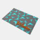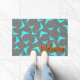 Retro-Bumerang-Patter in Aqua mit orangefarbenem "Begrüßungsgeschmack" auf grauem Hintergrund.