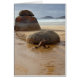 Dieses Foto von ausgeglichenen orangefarbenen Moos bedeckten Felsen an einem unberührten Strand mit sanft über den Sand rampendem Wasser und einem bewölkten und stürmischen Himmel über dem Ozean schafft eine sehr ruhige Zen-Landschaft. Passen Sie Ihr eigenes Mantra, Ihre Meditationssprache oder einen anderen Text für ein einzigartiges Design an.